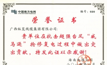 全國電線電纜產品質量監管AA級企業,全國重合同守信用單位,廣西“二十五”電線電纜產業重點扶持企業,國家強制性產品CCC認證